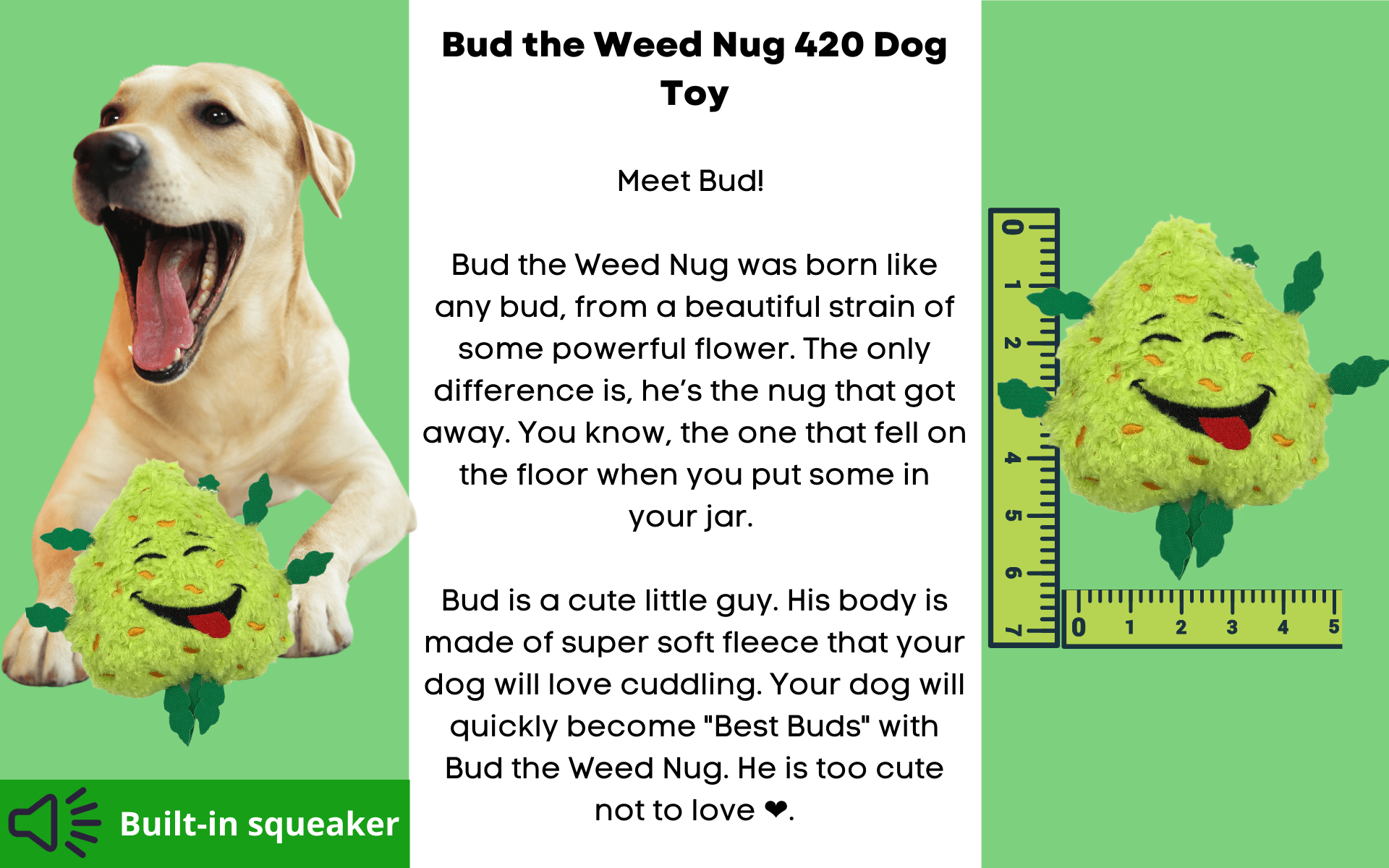 Bud's back is blank and looks like a big weed nug. Bud's body is made of super soft fleece that your dog will love cuddling with. Your dog will quickly become "Best Buds" with Bud the Weed Nug. He is too cute not to love. Bud even looks super cute in your car window!