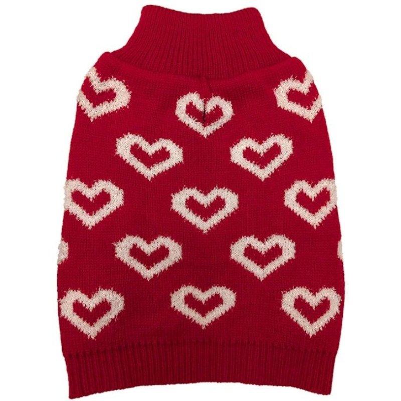 Fashion Pet All Over Hearts Dog Sweater Red. This adorable dual texture sweater is Soft and cozy. Features puffy chenille hearts on an acrylic knit background. Mock neck turtleneck and leash hole.