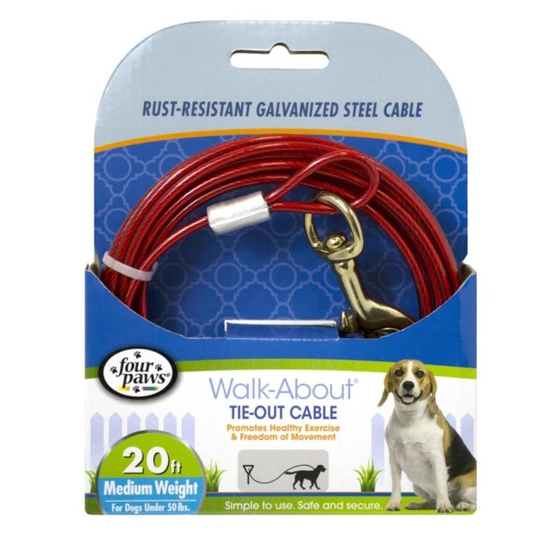 Four Paws Lightweight Tie-Out Cables are made from high-quality, vinyl coated steel aircraft cable. Allows your dog some freedom of movement, but keeps them secure in your yard and away from undesirable areas, such as gardens, compost piles, and patios.