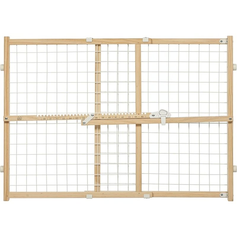 The MidWest Wood Pet Gate is essential for protecting both your curious pet and your home. The durable wood and wire mesh construction is designed to be sturdy enough to contain your pet, but lightweight enough to be portable. The no-slip bumpers protect your walls and prevent your gate from slipping. The patented comfort-squeeze latch allows for easy adjustment when placing the gate or opening to walk through.