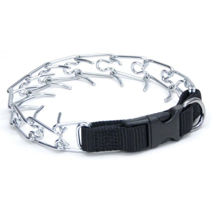 The Titan Easy-On Prong Training Collar is the perfect tough, safe and effective training collar for your willful dog. This chrome-plated collar features a nylon loop for optimum durability and strength, and will not tarnish, rust or break.