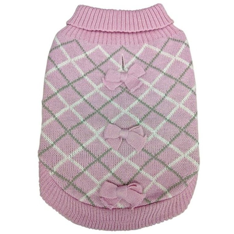 Fashion Pets Pretty in Plaid dog sweater is a contemporary twist on a classic. Feminine styling with matching knit bows. Features a leash hole for comfort on walks.