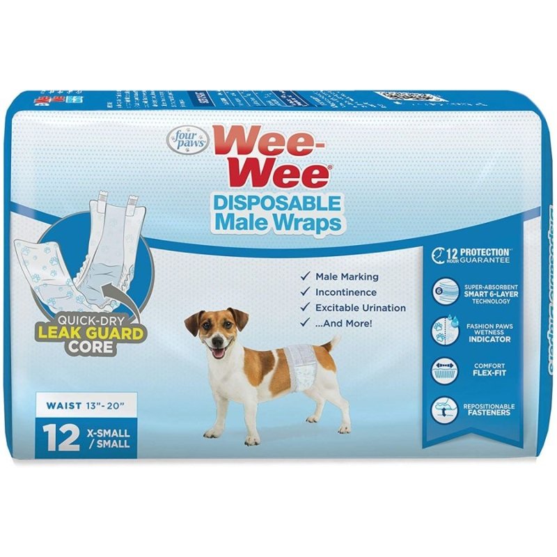 Four Paws Wee Wee Disposable Male Dog Wraps are comfortable, convenient leak guards designed specifically to solve male marking problems, incontinence, and excitable urination in dogs and young puppies.