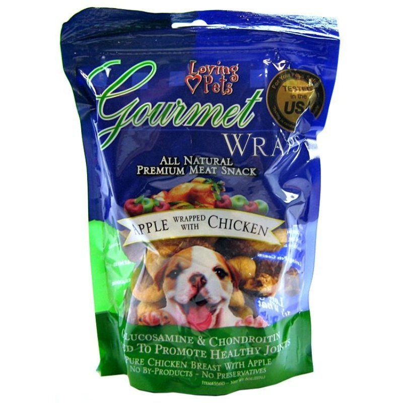 Loving Pets Gourmet Wraps Meat Snacks feature pure chicken breast filets wrapped around tasty, nutritious apples, with no animal by-products or preservatives. Added glucosamine and chondroitin support your dogs joint health, making this a treat thats tough to beat!