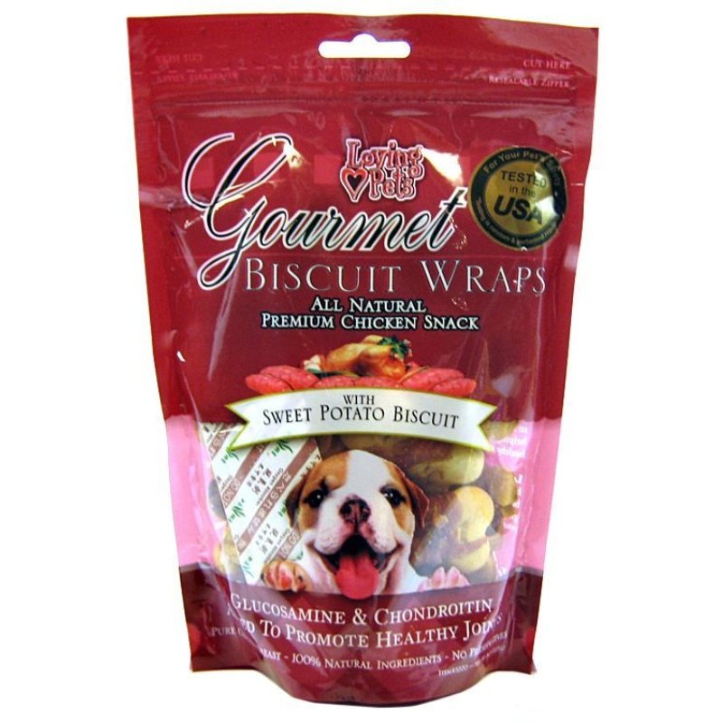 Loving Pets Gourmet Wrap Dog Treats feature all natural, crunchy sweet potato biscuits wrapped in premium chicken breast filets. Each treat features added glucosamine and chondroitin to support your dogs joint health, with no artificial ingredients, fillers or by-products.