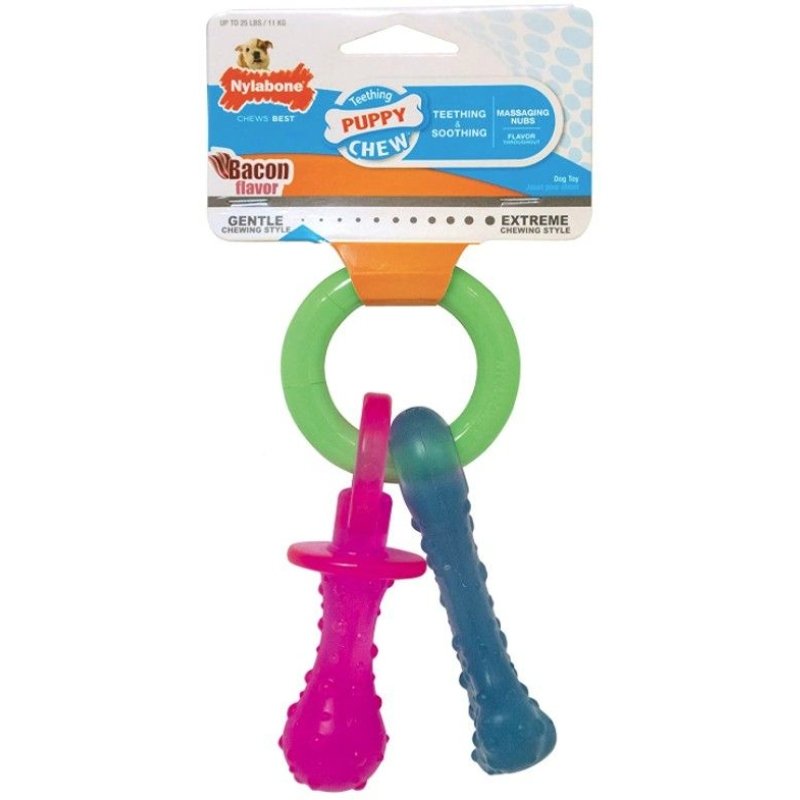 The Nylabone Puppy Teething Pacifier is specifically designed for teething puppies to encourage non-destructive chewing, massage the gums and relieve stress. Not recommended for dogs with any adult teeth.