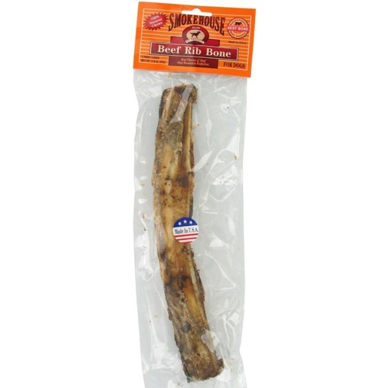 Smokehouse Beef Rib Bone Natural 12" Long Dog Treat. 100% Natural Beef Rib Bone Slow Roasted To Perfection. Meat and Cartilage is left on the bone for dogs to enjoy.